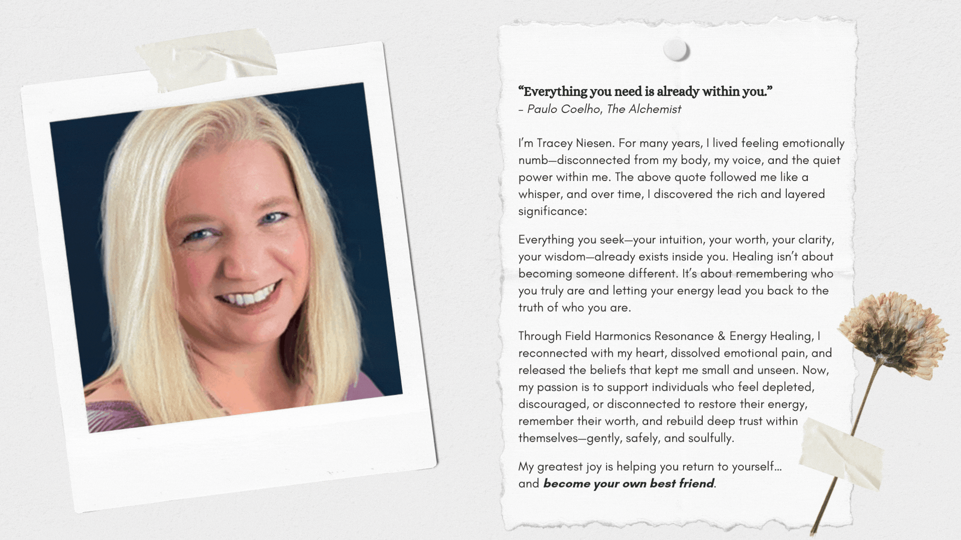 Through Field Harmonics Energy Healing, we gently dissolve the noise, the overwhelm, and the patterns that have kept you second-guessing yourself. As you realign, clarity returns. Confidence strengthens. Your voice becomes steady, not shaky. And decisions begin to feel simple again.... not because life is perfect, but because you feel safe in your own body.